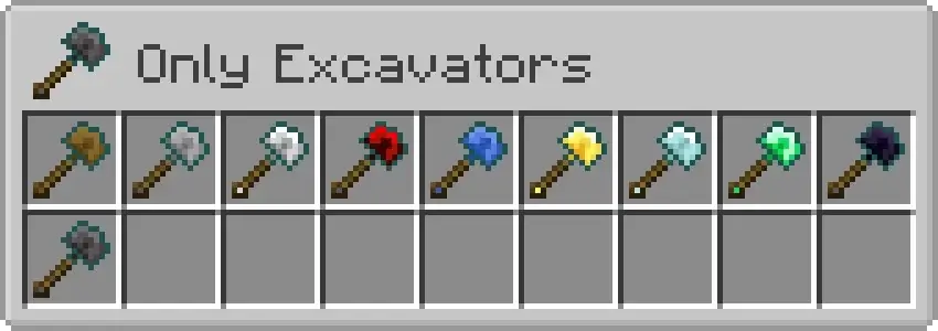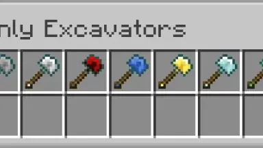 Only Excavators - добавляет экскаваторы, способные копать на площади 3×3 блока. Эти инструменты работают как улучшенная лопата и позволяют легче очищать землю, песок, гравий и другие подобные блоки. Кроме того, они могут быть изготовлены из всех материалов ванили, от дерева до незерита.