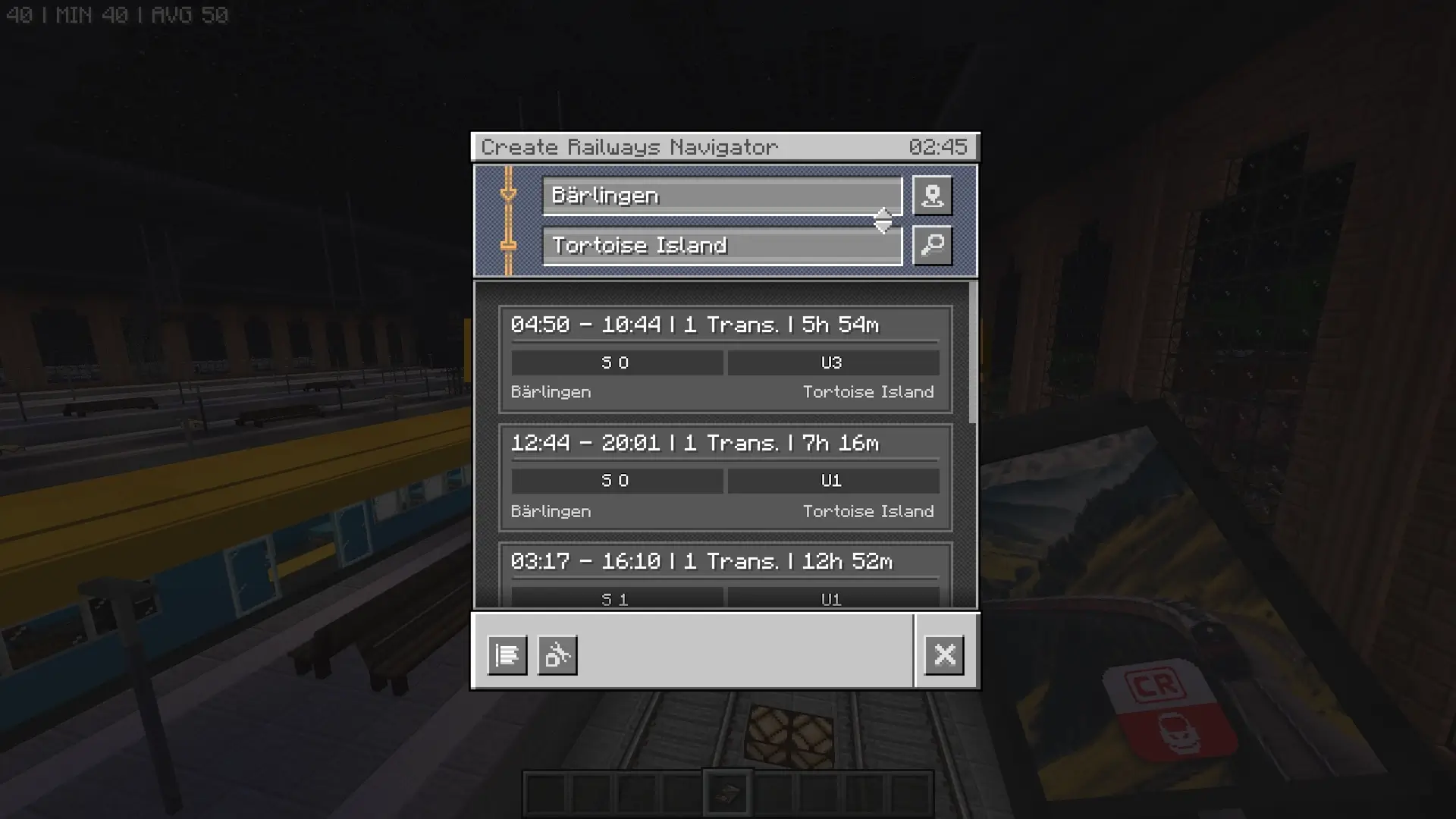 Create Railways Navigator - создан по мотивам DB Navigator (приложения в Германии, где, помимо прочего, вы можете узнать возможные маршруты движения поездов), предназначен для того, чтобы предлагать возможные маршруты движения поездов из мода Create в вашем мире Minecraft. Различные параметры настройки позволяют вам указать, какие станции следует рассматривать как единую станцию и как следует фильтровать и сортировать результаты навигации, чтобы вы всегда получали наилучшие предложения по маршруту.